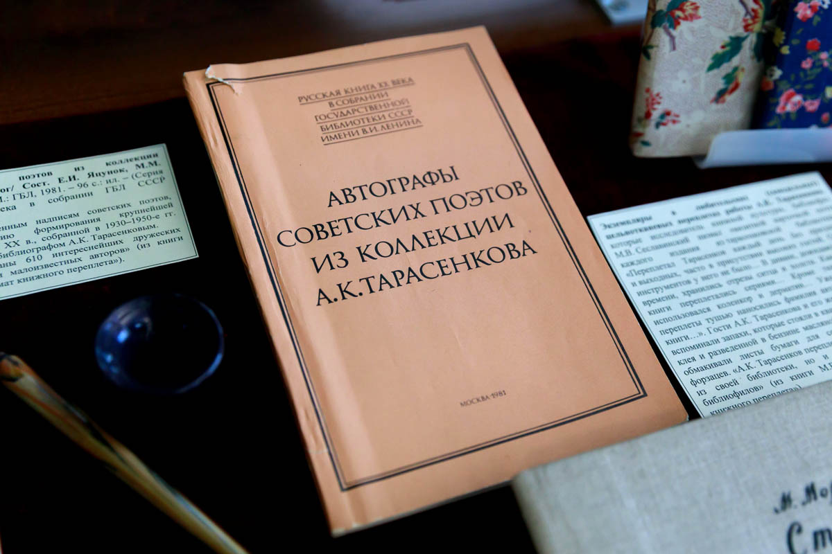 На выставке можно увидеть экземпляры с автографами; с рукописной владельческой надписью «Ан. Тарасенков» и аналогичным печатным оттиском, которым после смерти владельца помечались все книги без подписи; в любительских цельнотканевых переплётах работы самого Анатолия Кузьмича.