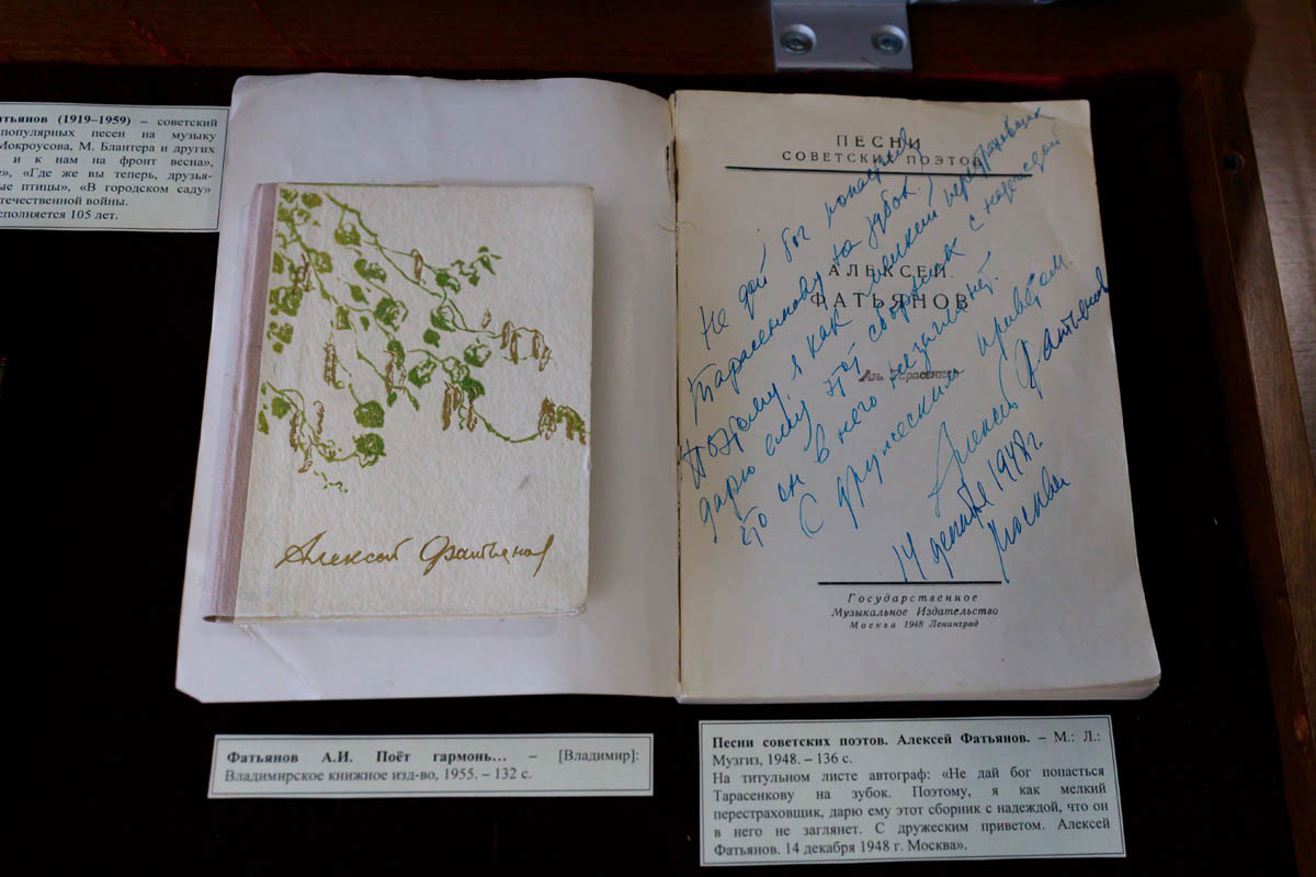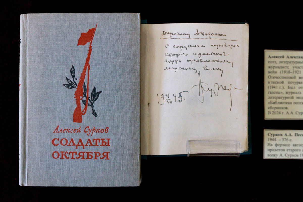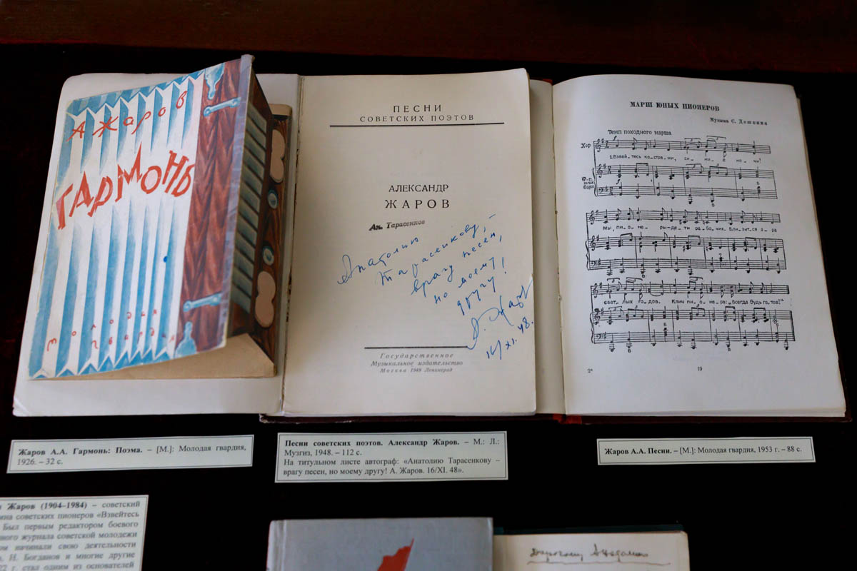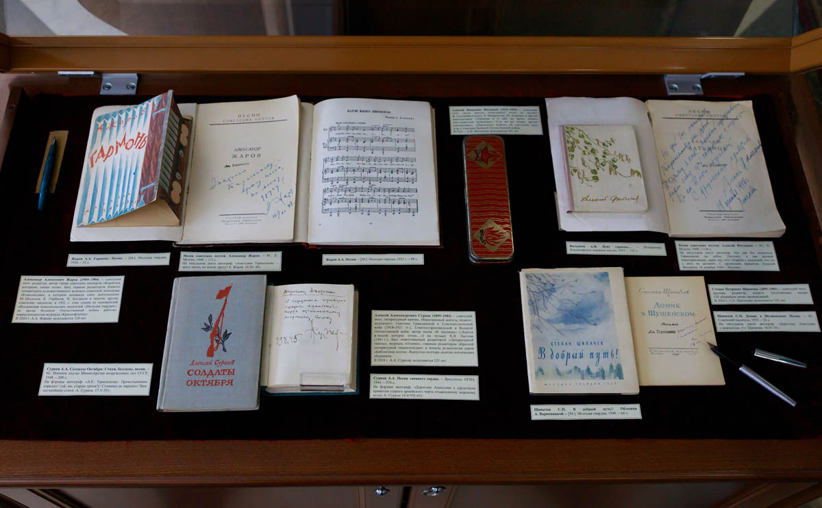 Мини-выставка посвящена необычной части коллекции. В экспозиции представлены экземпляры изданий произведений тех поэтов из собрания Анатолия Кузьмича, которые в этом году тоже являются юбилярами — Николая Асеева (135 лет), Сергея Городецкого (140 лет), Александра Жарова (120 лет), Марии Моравской (135 лет), Алексея Суркова (125 лет), Алексея Фатьянова (105 лет), Татьяны Щепкиной-Куперник (150 лет), Степана Щипачёва (125 лет). Ещё два юбиляра включены в экспозицию — два сборника стихов самого Тарасенкова, изданные в годы Великой Отечественной войны.
