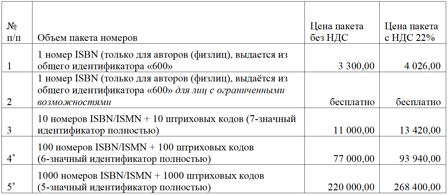 * Идентификаторы в 100 и 1000 номеров можно приобрести в рассрочку. Подробнее можно узнать у сотрудников Национального агентства ISBN.