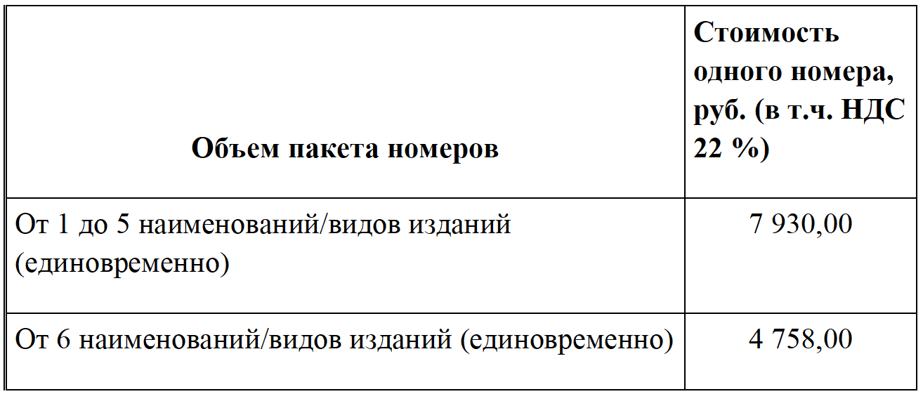 Стоимость услуг по международной стандартной нумерации сериальных изданий